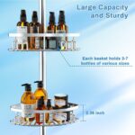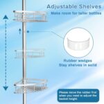 Adjustable Basket and Pole Height: Customize your storage space effortlessly. the baskets are fully adjustable. allowing you to move the basket up and down to accommodate taller bottles. This bathtub corner tension rod is adjustable for shower spaces with heights from 23.6 to 114.5 inches. no cutting required. It fits various ceiling heights. ideal for bathrooms. tubs. vanities. or kitchens.